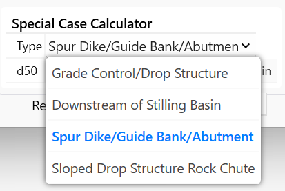 The Maricopa method has several customized equations for specialized settings.  These tend to be high energy settings that require larger rock to protect against the elevated hydraulic forces.  The computed rock diameter will generally be larger