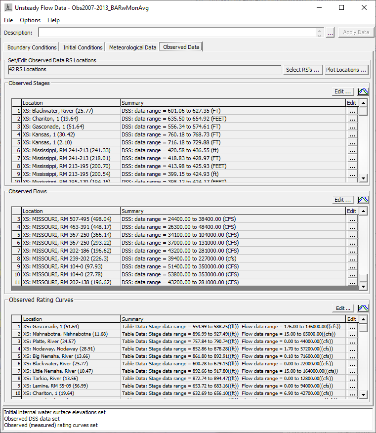 Observed data are entered into the Unsteady Flow Data editor from the Observed Data tab. This option allows the user to enter data in the form of observed time series data, high water marks, or an observed rating curves at a gage. When an observed time series is attached to a specific river station location, the user can get a plot of the observed flow or stage hydrograph on the same plot as the computed flow and stage hydrographs. Additionally the observed data will show up on profile and cross section plots. If high water marks are entered, they will show up on the cross section and profile plots when the Max Water Surface profile is being plotted. If an observed Rating curve from a gage is entered it will appear on the rating curve plot for comparison to the computed stage verses flow values.