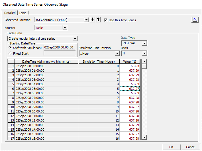 Create Regular Interval Time Series: This option allows the user to enter the observed data at a regular interval, such as 1 hour, etc… The user can select to have the Observed data start at the beginning of the simulation time (Which is based on the time window for the run) or they can select to enter a fixed start time for the data.