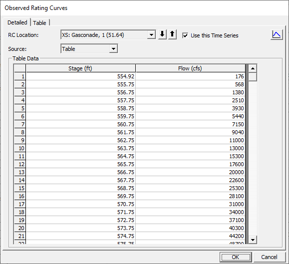 As shown in Figure 7-10, the window has two tabs. A "Detailed" tab and a "Table" tab. The detailed tab allows the user to view and edit data for one location at a time. The Table Tab allows the user to see the information for all the observed data locations. Whether you view the data in the detailed or table view, the user must first select a Source for the data. The "Source" options are: DSS; Table; Constant. Selecting DSS means the user has the observed data stored in an HEC-DSS file and wants to read the data from that DSS file. Selecting Table means the user wants to enter the data into a table directly in this editor. Selecting Constant means the user only has a "High Water Mark" for this location and wants to enter that High Water Mark as a "Constant" value. High Water Marks will be discussed in more detail below.