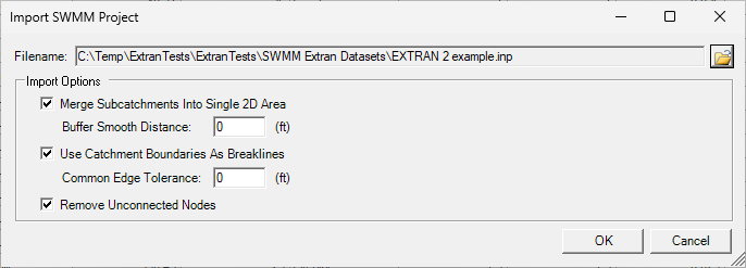 When Import SWMM Project Dialog launches, select the SWMM *.inp file you wish to import. Then select from the following options: