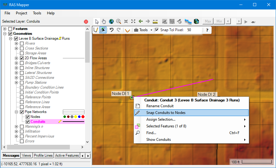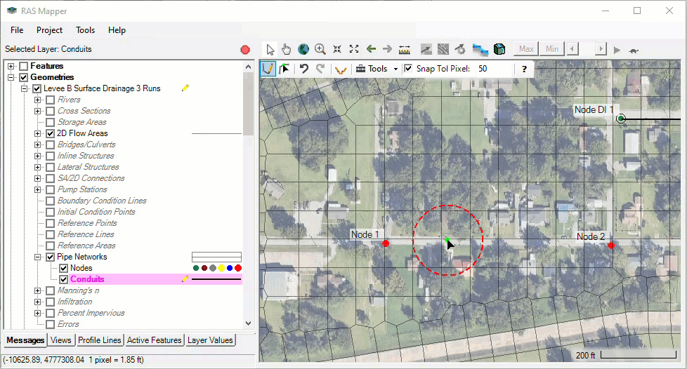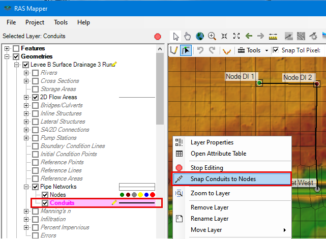 Pipe network geometries can be created by drawing Nodes, drawing connecting Conduits and defining the attributes of each in their respective attribute tables. All geometry creation and editing for pipe networks is done from HEC-RAS Mapper.