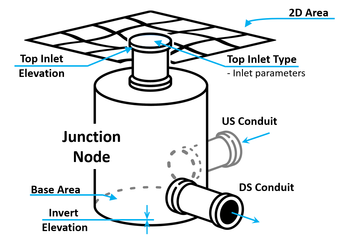 Pipe network geometries are defined by Nodes (represented by a points layer) and Conduits (represented by a polyline layer), and their associated attributes. Nodes provide the connections between multiple Conduits at junctions, provide connections from the pipe network to 1D and 2D surface elements (via top + side inlets or daylighting pipes such as culverts), and are where external boundary conditions can be introduced to the system.