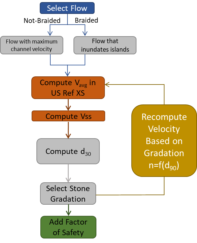 The general workflow of the USACE riprap design approach is illustrated in the figure below:
