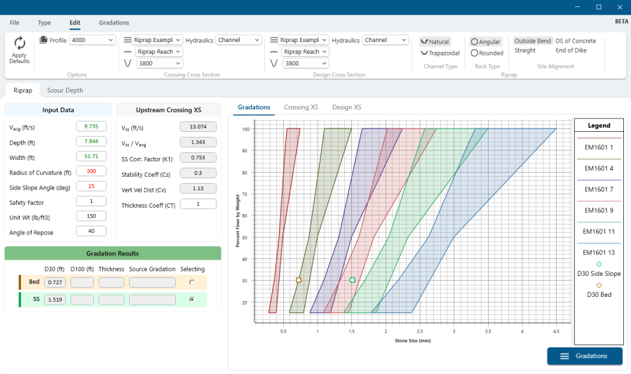 The Riprap Calculator in the current version of HEC-RAS follows the approach described in the USACE Engineering Manual EM 1110-2-1601: Hydraulic Design of Flood Control Channels (USACE, 1994). The design approach is outlined in Chapter 3 of EM 1601 and is based on the work of Dr. Stephen Maynord.