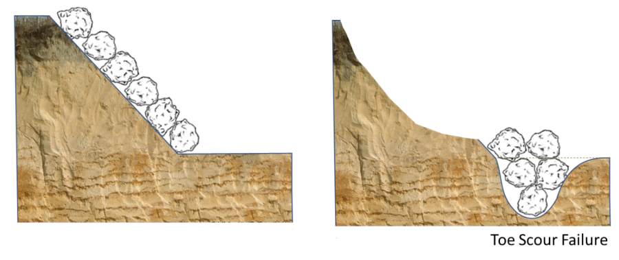 Toe scour and undercutting are common bank protection failure modes. Rivers often scour during floods. Scour, local erosion, often concentrated at the outside toe of a bend, can dig beneath placed rock. Riprap can collapse into a scour hole, after which, it no longer protects the bank.
