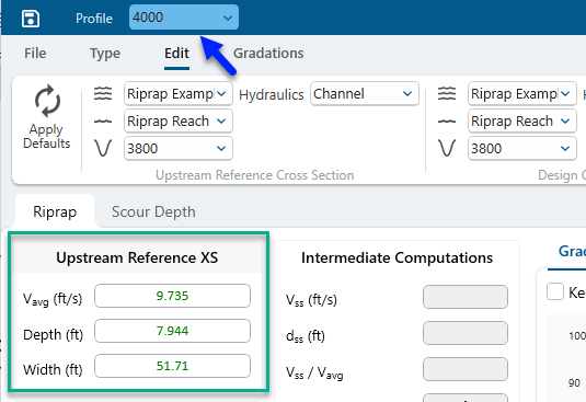 The Riprap Calculator will automatically populate the average velocity, depth, and width associated with the Upstream Reference Cross Section, and XS Hydraulics (channel or full cross section) selected.