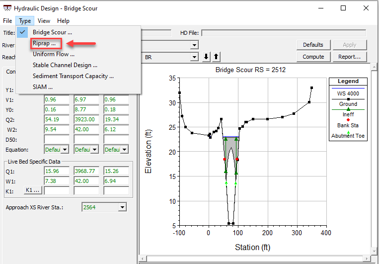 From the Hydraulic Design editor, Select Type to get a list of the different HD calculators and tools, and select the Riprap and Scour Calculator from that list.