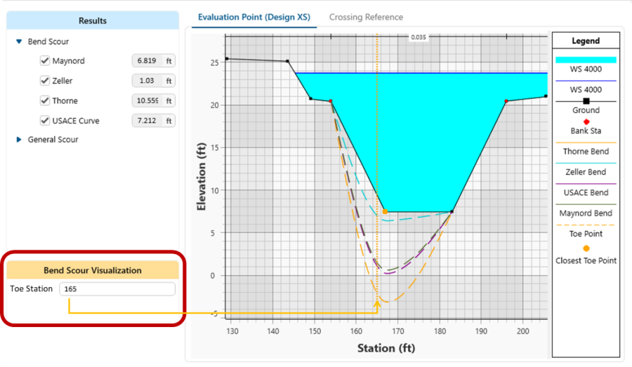 The bend scour visualization is dependent on the number and location of station elevation points. For example, the bend scour visualization above would look very different if the modeler used more station-elevation points to define the cross section.