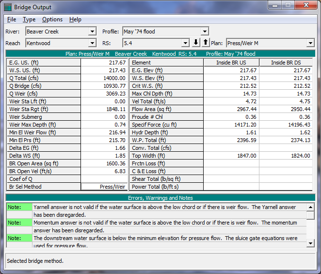 Bridge. The bridge table type brings up detailed output for the cross sections inside the bridge as well as just upstream of the bridge. The bridge table type can be selected for normal bridge crossings, or for bridges that are part of a multiple opening river crossing. An example of the bridge specific cross section table is shown in in the figure below.