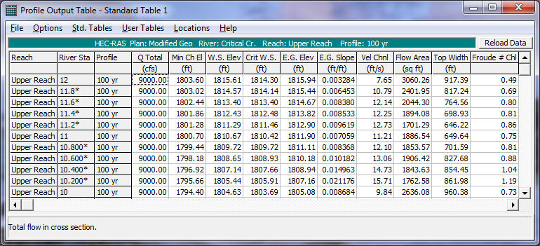 HEC-FDA. This table provides information that can be exported to the HEC Flood Damage Analysis (FDA) program. The table displays total flow, channel invert elevation, and water surface elevation.