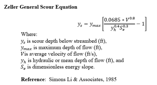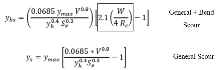 Mike Zeller, who developed this equation stresses that the bend scour version only includes general and bend scour, and that a full scour analysis requires a careful assessment of other processes including contraction, low flow, and bed form effects (Tetra Tech, 2009).
