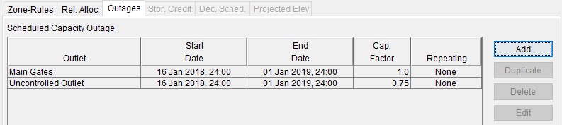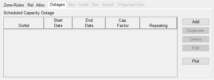 Capacity Factor—enter a value that represents the fractional portion of the outlet's capacity that will available for release during the outage. For example, if a spillway outlet has 4 equal gates and only one of them will be unavailable, then ¾ of the spillway capacity, or 75%, will be available and you would enter 0.75 as the capacity factor.