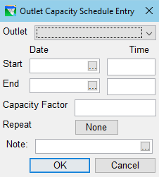 Click the Add button located to the right of the Scheduled Capacity Outages table. The Outlet Capacity Schedule Entry dialog (a.k.a, Outage Editor, "Figure: Outlet Capacity Schedule Entry Dialog") will open. To define the outage, make a selection for each of the following outage attributes: