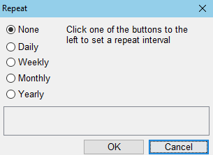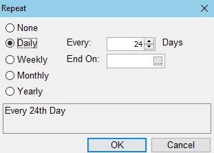 Repeat—The label on the Repeat button shows the basic recurrence interval for the outage. Click the button to open the Repeat dialog ("Figure: Outage Repeat Dialog") where you will specify the recurrence interval for the repeating outage.