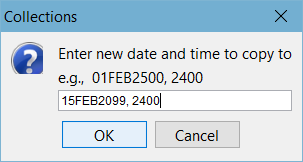 Enter the complete date and time to copy or shift the collection to. Use the same format as shown in the example ("Figure: Change Date/Time Input").