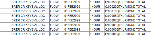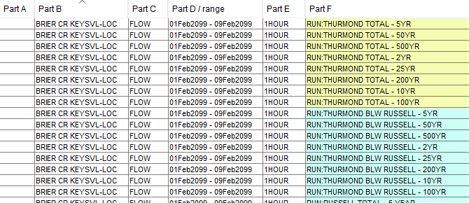 Data may be gathered from a variety of sources and numbers are often used to identify the uniqueness of the data. For example, if you use a rainfall-runoff model to compute flows for a set of frequency events with a variety of storm centerings, you are likely to use a string identifying both the storm centering and the recurrence interval as a way to identify the output. "Figure: Example Data with Numeric F-parts" shows what these pathnames might look like.