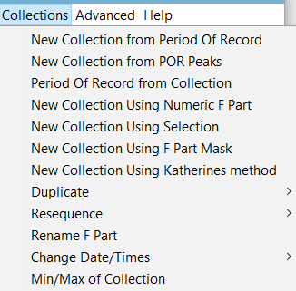 With the Collection Utilities Plug-In installed, a Collections menu is added to the menu bar of DSSVue providing access to several options for creating and managing collections. Many of these options represent different ways to create a collection. At present, collections can only be formed from individual records that already exist in DSS. Other options in the Collections menu include features to copy, re-number, rename, and perform some simple statistics on the collection members.