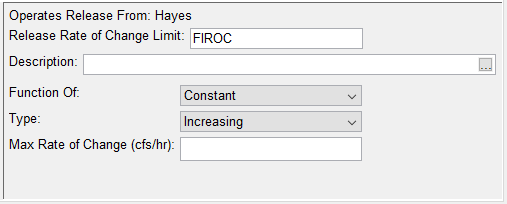 - Type — this is the Limit type. Select either Increasing or Decreasing. Note: when evaluated, an Increasing Flow Rate of Change Limit results in a maximum release limit and a decreasing Flow Rate of Change Limit results in minimum release limit