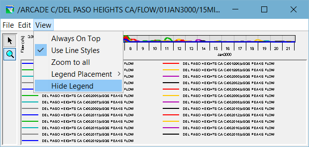 If you select a collection dataset (condensed collection pathname) and click the plot button, DSSVue will produce a plot window that appears to be all legend ("Figure: Collection Plot - All Legend"). This is because a collection is usually a large group of individual datasets, each of which must be included in the legend. See the next section for more information.