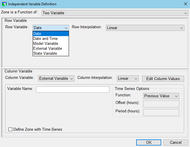 Since the Independent Variable Definition editor is used by a variety of features throughout ResSim, to minimize repetitiveness, the description for using it has been moved to Appendix C. However, there are two unique options specific to zones that should be mentioned, and they are included below.