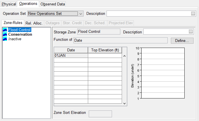 As illustrated in "Figure: Reservoir Editor Showing New Operation Set", when you create a new Operation Set, ResSim automatically creates a Zone-Rules tree that contains three default reservoir operation zones: Flood Control, Conservation, and Inactive. You may wish to rename these default zones and add descriptions. You may need to define additional zones as well. This section will detail how to edit the zone definitions of your operation set.