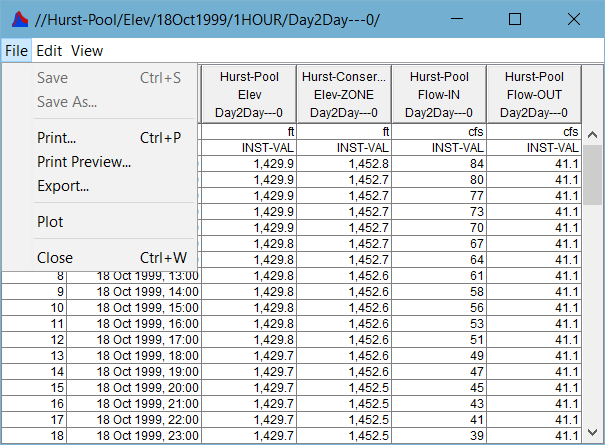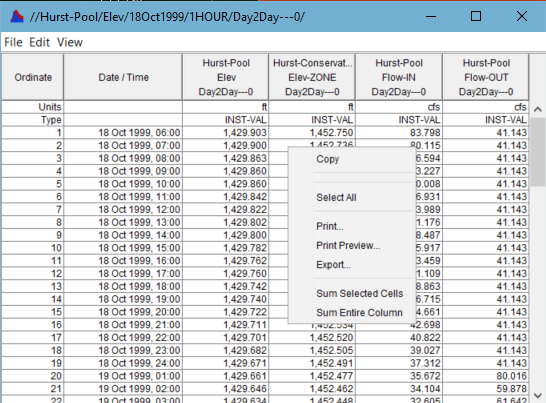 When tabulating data from a ResSim Plot or from DSSVue, the Table window's File, Edit, and context menus provide options for printing, exporting, and copying the contents of the table.
