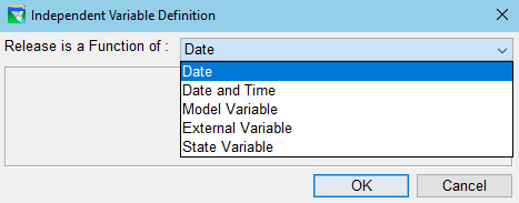 - Release is a Function of:—this field, at the top of the editor, is the independent variable (Date, Date and Time) or variable type (Model Variable, External Variable, or State Variable) for your function.