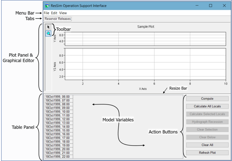 The top portion of each tab is a Plot Panel (and/or Graphical Editor). A Table Panel takes up most of the bottom portion of the tab with a stack of Action Buttons taking up the rest. As you add Variables to the tab, they will appear as columns in the Table Panel. A barely-noticeable Resize bar separates the top and bottom portions of the tab; you can "grab" this bar with your mouse and drag it up or down to resize the two panels.