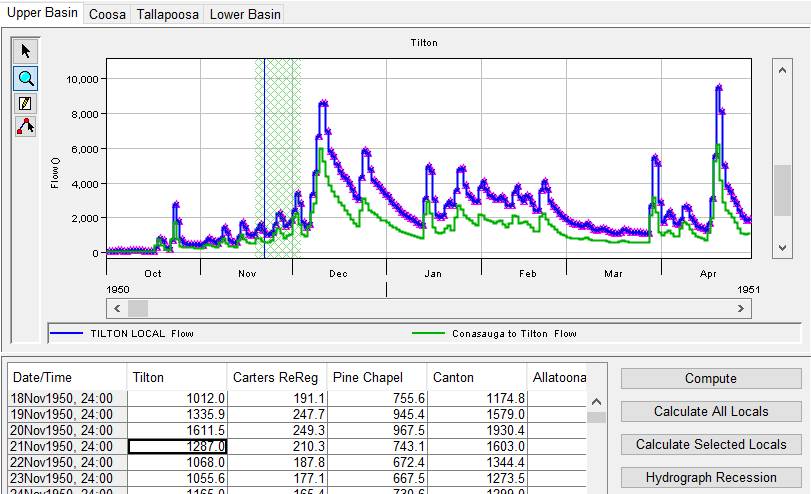 For example, "Figure: OSI Tab—Plot Panel Showing Active Dataset" shows the Plot Panel displaying time-series data for the selected (active) variable as well as another time-series dataset that was selected to be plotted with it. The plot also shows a green cross-hatched vertical bar indicating the range of the data currently displayed in the table and a blue vertical line indicating the point in time of the selected cell in the table.