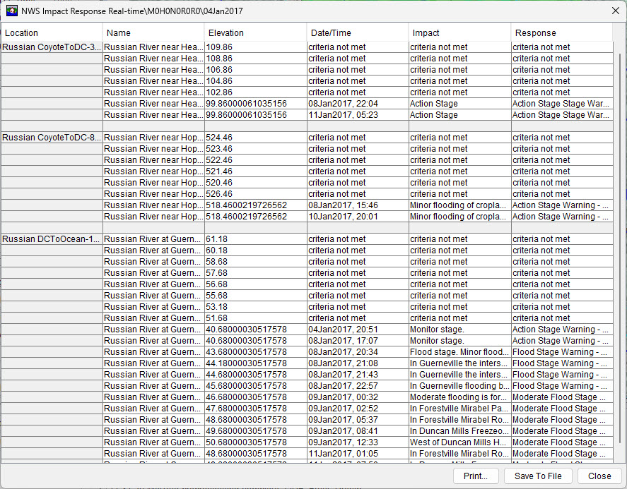 This report is available only if the HEC-FIA model alternative includes an Impact Response element. It organizes and displays Impacts and Responses by location. If multiple rules exist at a single location, they are grouped and shown together. You can navigate between locations using the dropdown menu or the forward/back arrows.