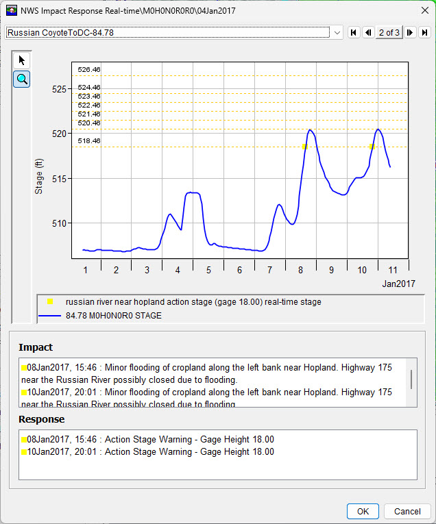 Use the dropdown list or navigation arrows to cycle through available rules (e.g., Russian River near Hopland Moderate Flood Stage). The report displays the hydrograph plot and relevant rule information in the Impact and Response sections.