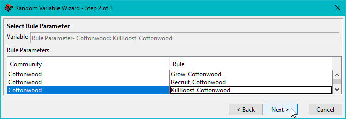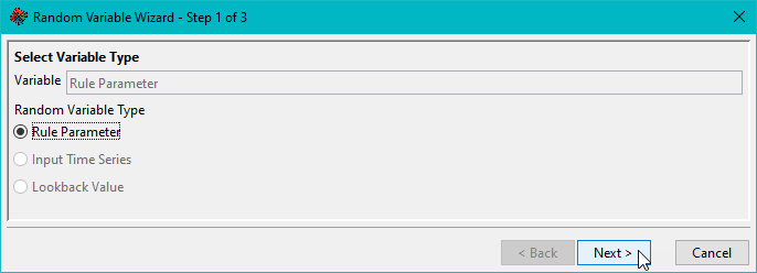 The Variable field is displayed at the top of each screen in the Random Variable Wizard. As a sensitivity variable is configured, more information is added to the Variable field. At the end of the configuration of a sensitivity, this field displays the selected variable type and rule parameter following the format of “<Variable Type>- <Rule Parameter>”. The content of this field is the same as what is displayed under the Parameter column in the Sensitivity Variables tab.