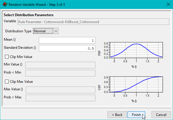 - Click the Edit button for the selected sensitivity variable. This loads the Random Variable Wizard’s Step 3 screen.