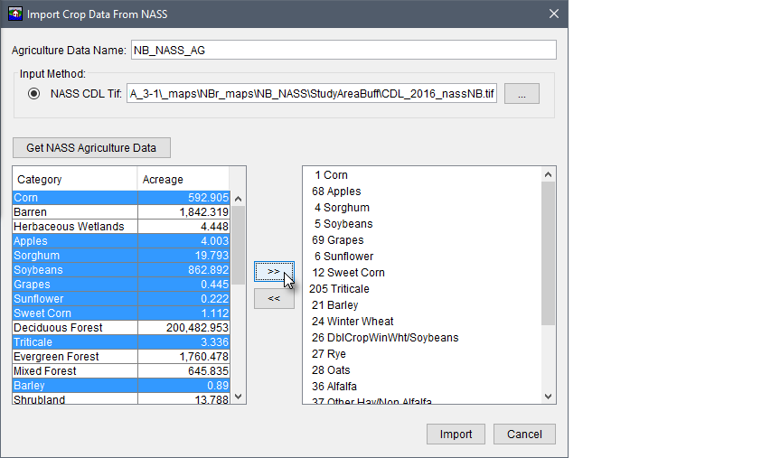 - Now that everything is defined, click Import. The Import Crop Data From NASS dialog box closes. HEC-FIA then filters the NASS CDL (*.tif) to only include cells with the crop/category types that were selected for import (e.g., Corn). Under the Agricultural Grids folder in the Study Tree, the name of the agricultural grid (NB_NASS_AG) appears.