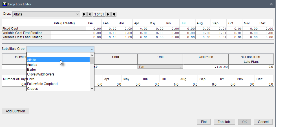 To edit a defined agricultural grid, from the agricultural grid shortcut menu, click Edit, and the Crop Loss Editor opens. From the Crop Loss Editor, the user can select and edit specific crops via the navigation bar. The navigation bar allows users to move quickly between multiple crops in the selected agricultural grid. The navigation bar includes a dropdown list, which allows users to select a specific Crop (e.g., Alfalfa). Alternatively, users can navigate through the list of crops by clicking the navigation buttons.