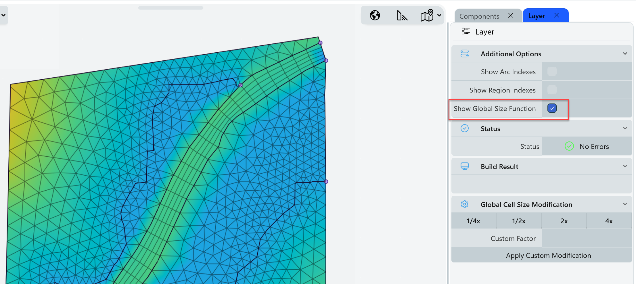 In stage 2, arcs generate computational mesh faces based on the chosen spacing, with some massaging around joints so they can work with neighboring arcs. Because arc faces are generated first, they can constrain the overall mesh cell spacing. While a mesh region may request 500ft cells, neighboring arcs set to use smaller cells (and limited cell growth rates) may limit the realized cell size to far less than that. We call this constraint the cell size function, and you can visualize it in the UI from the Layer tab with the Conceptual Mesh layer selected.