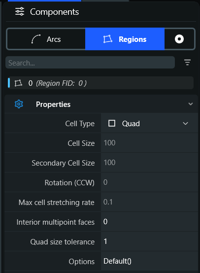 Region properties control cell generation inside the conceptual mesh region. In the Components pane, regions have the following properties: