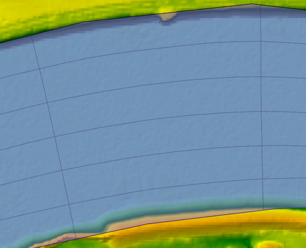 Our selected cell-sizes (800ft on the southern arc constrained by the channel, 100ft on the northern arc) alongside the default Max cell stretching rate of .1 over-constrain the problem. The meshing system tries to telescope down to the background cell-size where it can inject cartesian cells, but it can't get there fast enough. If we increase the Max cell stretching rate, we can see our cartesian cells (shown below). (Please note this example is for demonstration purposes. You should not arbitrarily change cell-size growth rates unless you're comfortable with the numerical error being introduced.)