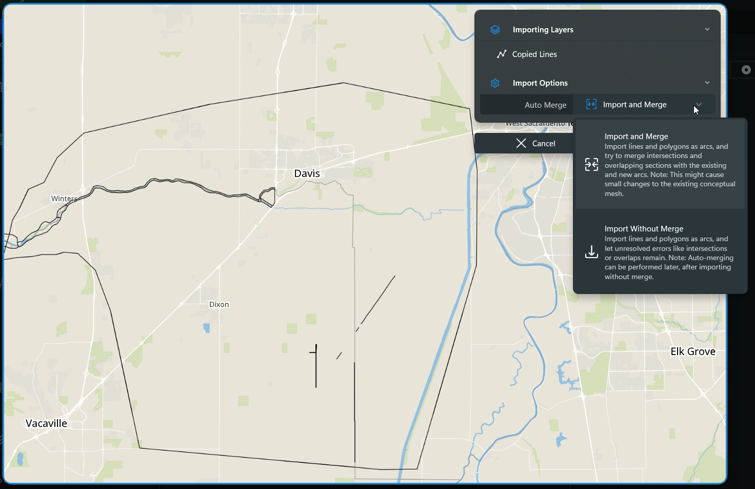 - Import and Merge: Pastes the Arcs into the mesh, reconciling intersections, duplicate Arcs, and other topological errors.