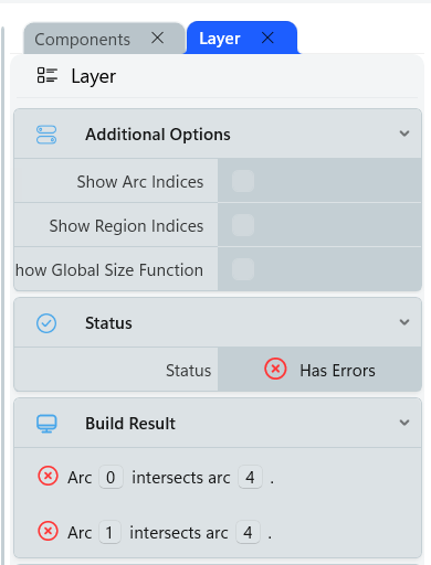 After building or importing Arcs into a conceptual mesh, it may return a number of errors. These are typically geospatial errors that need to be fixed before we can continue on with mesh generation. The offending area of the model will be highlighted in red, and a list of errors will be in the Layer tab.