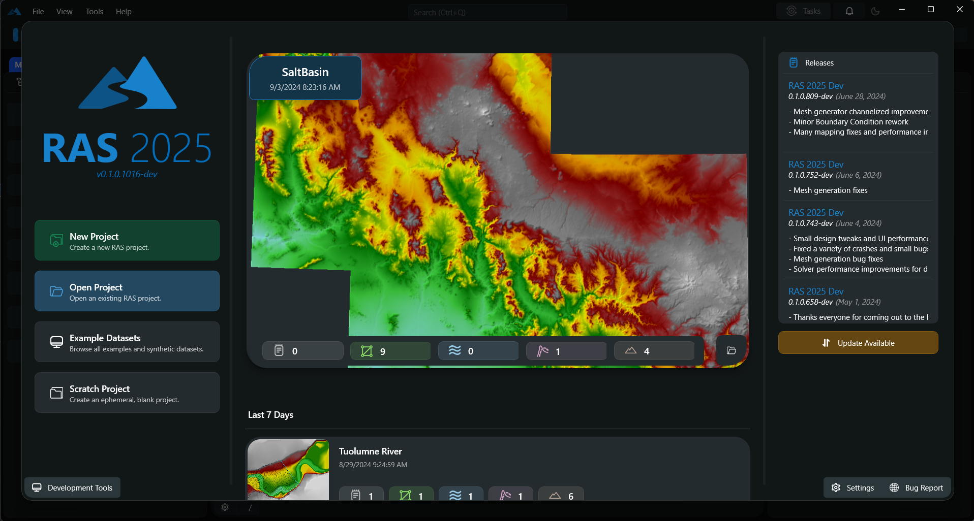 HEC-RAS 2025 Alpha is now available! Please be mindful that this is a preview release of the future of RAS - there are many unfinished and unstable corners of the software. (Images below are likely to change throughout the alpha period.) Our goal is to rapidly improve the software over the next year of development, pushing updated alpha builds every few weeks with new features and bug fixes. Please check back often, and hit that update button!
