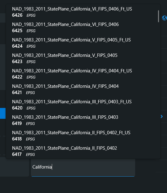 | You can also search for a projection by name. We're utilizing a database from PROJ (see https://proj.org) to search for well-known projections. This must be mapped to an EPSG code, so not all projections are available with this option. We're working to expand and improve the search option to include other common well-known projections. |