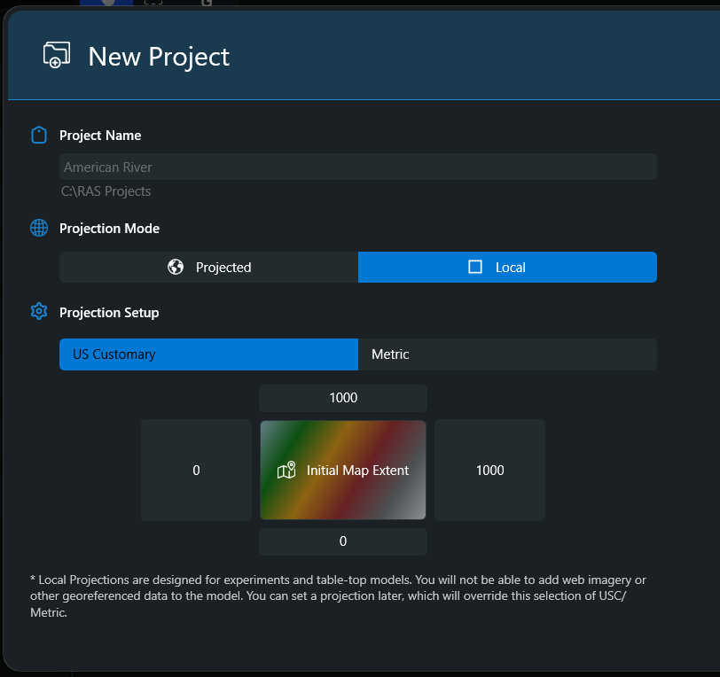 RAS can still run in tabletop mode (without a projection), but you have to assert this is the mode you will be working in when you're first setting up the model. This helps RAS set spatial tolerances appropriately, and controls certain behavior around mapping and terrain generation. You also have to specify whether the units system is US Customary or Metric, which is normally determined from the associated model projection.