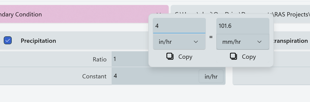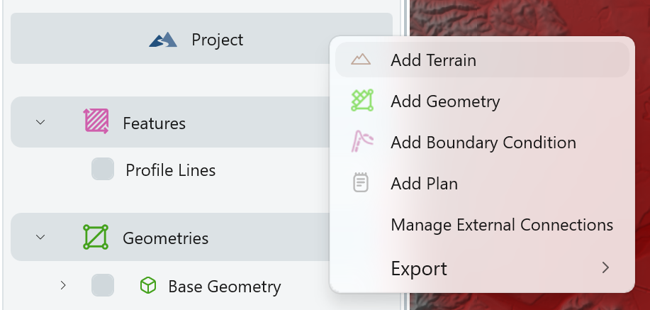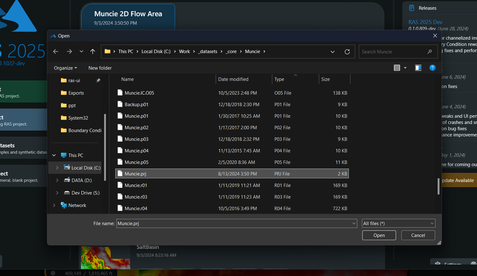 Opening a project file is supported for RAS 2025 projects (*.ras), but there is also an experimental RAS version 6 (*.prj) importer. This is a 'best effort' importer, which tries to convert geometry/boundary-condition/terrain inputs to their 2025 counterparts. The v6 importer will be expanded and improved over the coming years, and we'll highlight new feature support as it arrives. Note that v6 geometries cannot be run with the new solver, so their principle use is for visualization and vanilla GIS operations (copy river centerline as mesh arc, etc.). Any file that can be opened from the Open Project page can instead be dragged and dropped onto the interface.