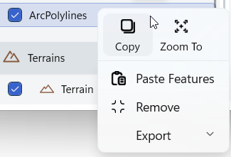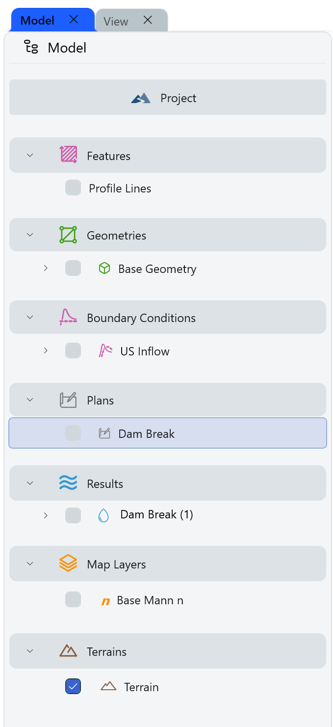 The model tab is your primary layer list for enabling and disabling layers in the map window. Many other elements in the UI react to the selected item in this list. Layers are grouped by category and file type. The root 'Project' element also has menu options for project-wide actions.