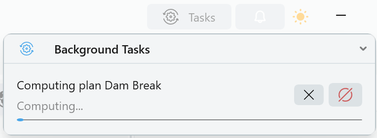 Tasks: The Tasks button gives you a summary of any ongoing, long-running tasks, with options to pause or cancel them. Hydraulic solvers, terrain imports, and map generation all emit tasks to this area.