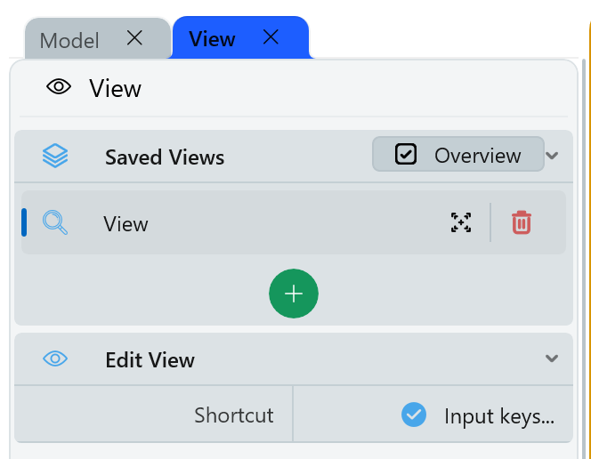 The View tab is docked behind the Model tab in the default configuration. If you're zoomed into an area of interest, you can save a 'View' (extent + zoom level) of that region. Views can be mapped to different hotkeys to enable rapidly switching between them. Views are saved to the mapping/visualization file (*.vis). Views can be renamed by selecting the text in the table, and the buttons on the right will zoom-to or delete the view.