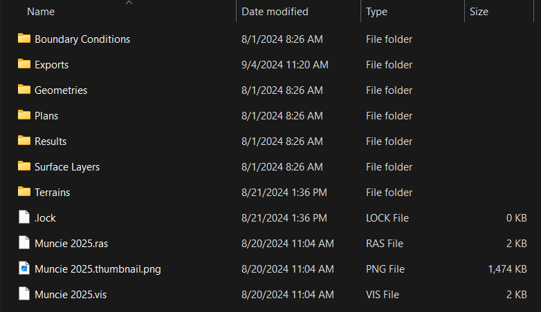 We've redesigned how models are stored to disk. We wanted to simplify file management, enabling users to control their own backups and share models easily. Here is an example RAS project directory: