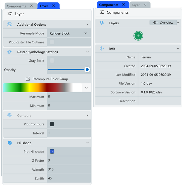 The Components and Layer tabs react to the selected layer in the Model tab. This area is still a work-in-progress, but our general organizational philosophy is that model elements (affecting hydraulic results) go on the Components tab, while visualization properties and layer metadata go on the Layer tab.